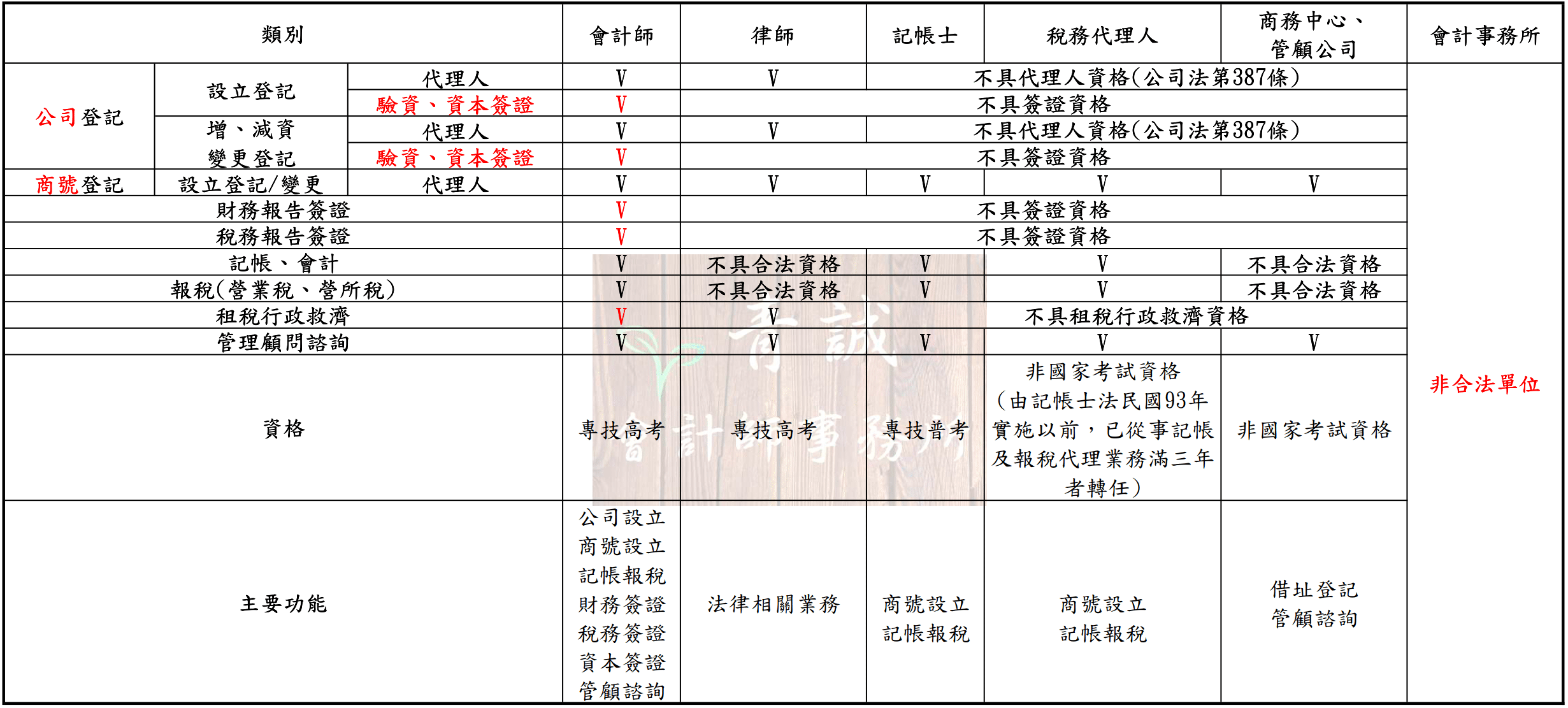茲將會計師、記帳士、稅務代理人等可執行業務整理如下表:
