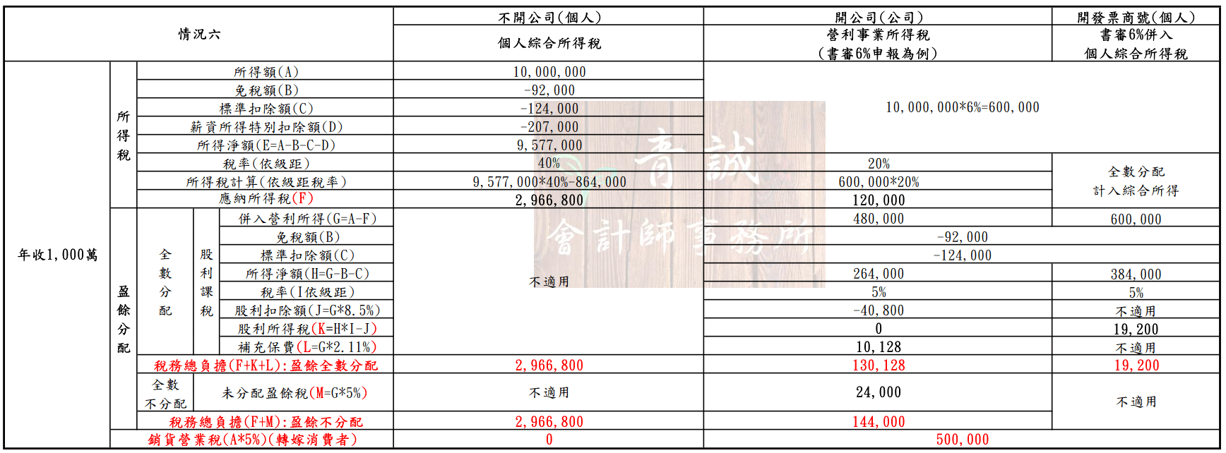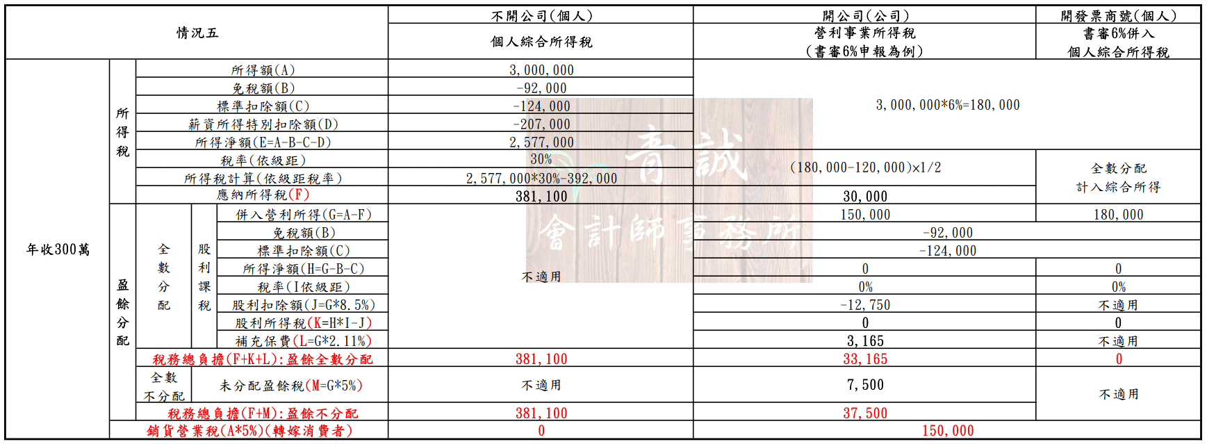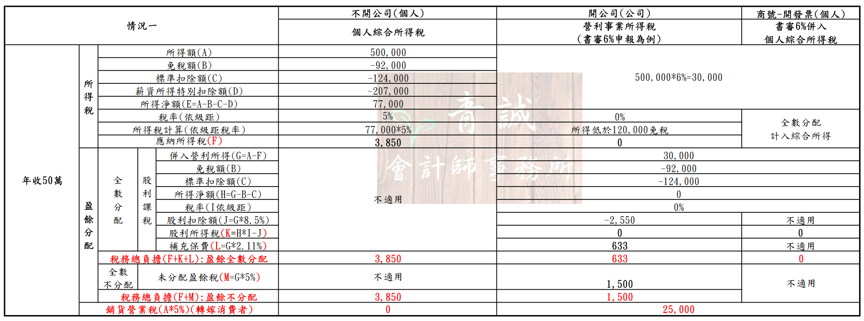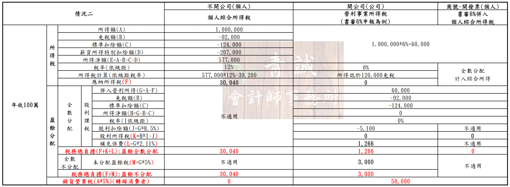 - 承1.,在多考量營業稅的情況下,只要收入達到150萬以上,開公司稅務負擔遠小於不開公司。